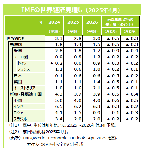 ◆国際通貨基金(IMF)が2025年4月に公表した世界経済見通しによると、世界のGDP成長率は、2024年の+3.3%から2025年は+2.8%、2026年は+3.0%への減速が見込まれています。米国の新たな関税措置や貿易相手国による対抗措置がもたらす貿易摩擦の激化と政策の不確実性の高まりなどが、世界経済に大きなマイナスの影響を与えるとされています。この影響を踏まえ、多くの国々の成長見通しが、前回見通し(2025年1月)から下方修正されています。先進国のGDP成長率は、2024年の+1.8%から2025年に+1.4%、2026年に+1.5%へ、また新興・発展途上国のGDP成長率は2024年の+4.3%から2025年に+3.7%、2026年に+3.9%へとそれぞれ減速が見込まれています。
