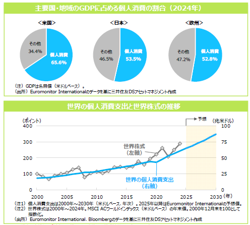 経済活動の中でも、個⼈消費は重要な要素であり、各国・地域のGDPにおいても、⼤きな割合を占めています。