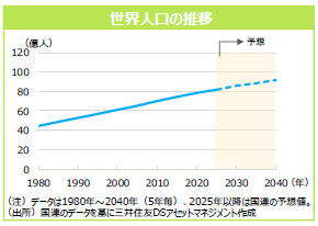世界⼈⼝は2020 年の約79 億⼈から2030年に約85億⼈、20年後の2040年には約91億⼈にまで増加すると予想されており、今後も世界の経済成⻑が続くと⾒込まれます。