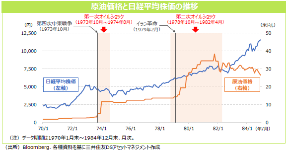 第二次オイルショックは、1978年末から原油価格が上昇し、1979年のイラン革命で本格化しました。中東情勢の不安定化などから原油価格は急騰しましたが、日本では省エネルギー化やエネルギー源の多様化、産業構造の転換が進んでいました。そのため、原油高による日本経済への影響は第一次オイルショック時ほど深刻なものではなく、日経平均株価も底堅く推移しました。