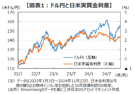 ■というのも、ここ数年のドル円は、おおむね日米の長期実質金利差(期待インフレ率を控除した10年国債利回りの差)に連動して推移してきましたが、足元のドル円の水準は、こうした金利差の推移から大きく乖離して、円安が行き過ぎているように見えるからです(図表1)。
