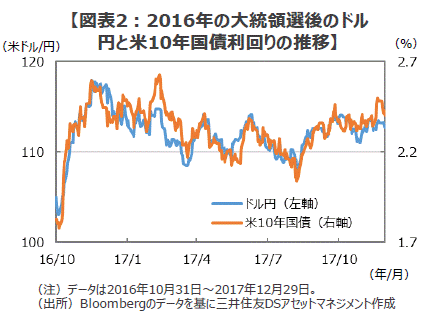 ■2016年のトランプラリーの際にも、トランプ減税への驚きと期待から米10年国債利回りは1.8%台から2.6%台へ急上昇し、ドル円も102円台から一気に118円台まで円安ドル高が進みました。ちなみに、この大統領選挙の結果を材料とした米長期金利の上昇とドル高は、わずか41日間(11月4日~12月15日)でピークを付けて終了しています(図表2)。