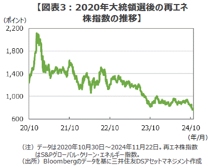 ■また、前回2020年の大統領選でバイデン氏が勝利した時は、前トランプ政権の時代に停滞していた気候変動への取り組みが大きく前進することへの期待感から、関連する株式への市場の関心が急速に高まる事となりました。この時、世界の再生可能エネルギー関連株の値動きを示す「S&Pグローバル・クリーン・エネルギー指数」は大統領選直後の約2カ月間で約73.2%の大幅上昇となりました。しかし、政権交代をきっかけとした再生エネルギー関連株の上昇は長続きせず、その後下落に転じた同指数は大きく値を下げ、今に至るまで大統領選挙の直後につけた高値を一度も更新できずに、ピーク時と比べて6割超も安い水準で低迷しています(図表3)。