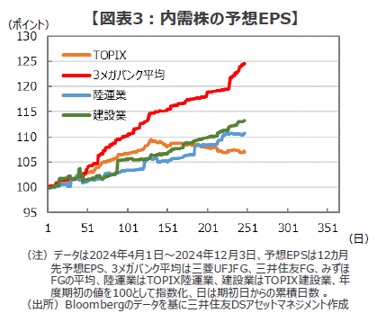 ■一方、株価が大きく上昇した2023年度を見ると、12カ月先予想EPSは年度末にかけて加速しつつ、上昇が続いています。そして2024年度の予想EPSは、春先は昨年度と比べても好調な推移を見せていましたが、株価が伸び悩んだ夏場以降は急ブレーキがかかっていることが確認できます(図表1)。