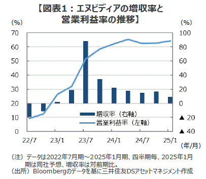 ■また、エヌビディアの増収ペースは減速傾向にあります。2024年11月-2025年1月期の売上高の会社予想は前四半期比約9.2%のプラス、年率で約42.1%の増収見込みとなっています(図表1)。もちろん、通常の会社に比べればとても高い成長率なのですが、昨年来の増益ペースと株価の上昇ピッチに目が慣れてしまっていると、物足りなく感じる投資家も少なくないのではないでしょうか。