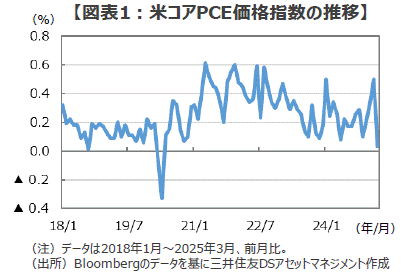 ■パウエル議長がタカ派姿勢を鮮明にしたことに、驚いた市場関係者も少なくないでしょう。というのも、①FRBが最も重視するインフレ指標の一つである3月のコア個人消費支出(PCE)価格指数は5年ぶりの低水準となる前月比±0%まで減速して、インフレは落ち着きを見せています(図表1)。また、②経済学の一般的な考えとして、米国のような大国が課す関税は普通の国と比べて物価に与える影響が限定的とされています。さらに、③消費税や関税によるインフレの押し上げ効果は一時的で基調的なインフレを変化させることは稀ですし、④ベッセント財務長官も指摘するように、足元で政策金利であるフェデラル・ファンド(FF)金利は米2年国債利回りを大きく上回る「金融引締め状態にある」からです(図表2)。