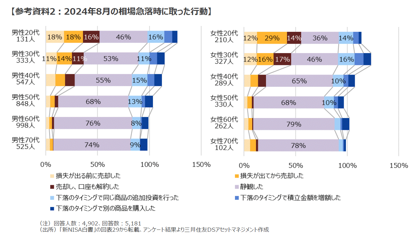 ■具体的には、①投資先を決める際の理由が「将来の値上がり期待」と「分配・配当金」に極端に偏っていること(巻末:参考資料1)、②「令和のブラックマンデー」と呼ばれた2024年8月の相場の急落局面で投資をあきらめてしまう人が意外に多かったこと(巻末:参考資料2)、そして、③若い世代ほど「想定している投資期間が短期」で、投資先の選択に「変動が小さく安定した値動き」を重視する傾向が強いこと(巻末:参考資料3-1、3-2)の3つです。こうした考え方や投資行動が「残念でならない」のは、いずれも投資のセオリーや常識的な考え方に反する、投資家の「ダークパターン」以外の何物でもないからです。