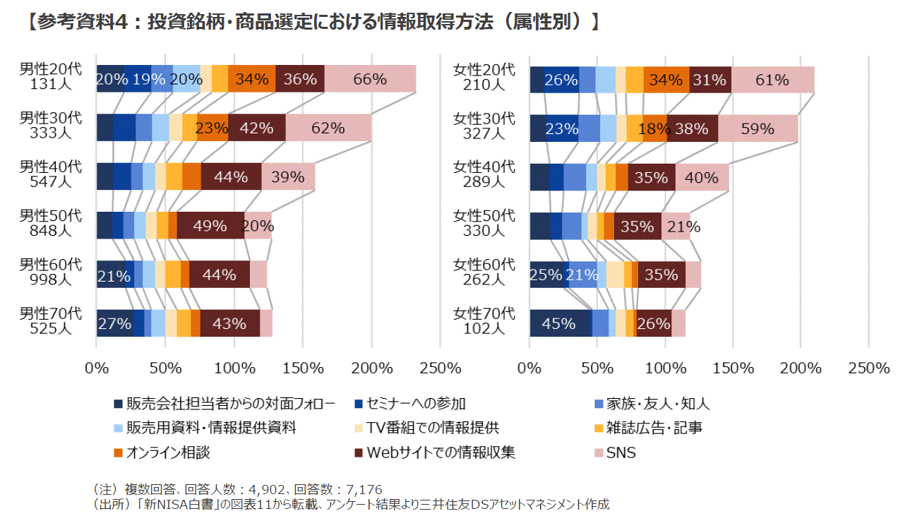 ■特に気になるのは、「新NISA白書」にもあるように、20代や30代の方々を中心に投資判断の材料としてSNSを利用する割合が高いようです(巻末:参考資料4)。しかし、ファクトチェックがされていない情報をうのみにし、更に、エコーチェンバー効果(信じたい情報ばかり集まってしまうこと)が加わることで自身の相場観を「これが真実だ」とばかりに過信して思い切った投資をしてしまうのは、冒険を通り越した危険な賭けにも思えてきます。嫌味な言い方にはなりますが、相場という怪物に対して、私たちはあまりに無力であることを知る必要があるのではないでしょうか。