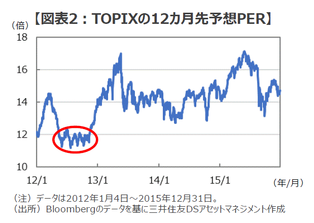 ■一部の海外投資家は、こうした「アベノミクス相場」の再来を「高市トレード」に期待しているようです。ちなみに、アベノミクスが始まる前は、①日本経済は長引くデフレに苦しみ、②日本株は旧民主党政権下で低迷が続き(図表1)、③東証株価指数(TOPIX)の予想株価収益率(PER)はレンジの下限と目される12倍を下回る状態が続いていました(図表2)。