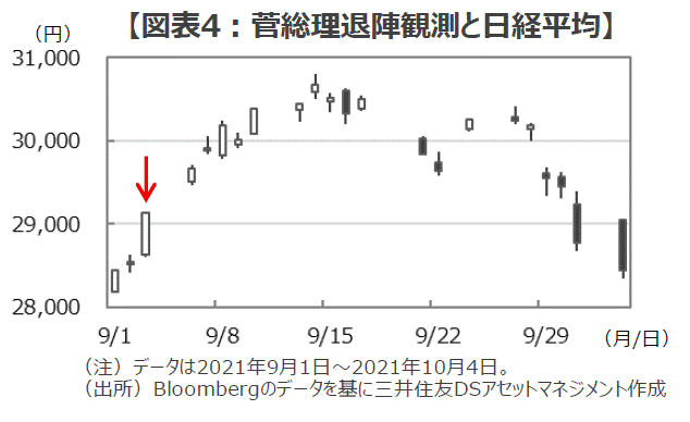 ■こうした観点から「高市トレード」のインパクトについて考えるなら、過去の自民党内における想定外のトップ交代がヒントとなるように思われます。例えば、昨年9月の自民党総裁選で予想を覆して石破新総裁が誕生した際には、高市氏の勝利を見越してそれまで上昇していた日経平均は一転急落し、3日間で2,020円80銭(▲5.1%)下落して「石破ショック」と呼ばれました(図表3)。また、約4年前の2021年9月、当時の菅総理の退陣観測を受けて、日経平均は8営業日で2,126円59銭も上昇(+7.5%)しました(図表4)。しかし、いずれも「自民党内」でのトップ交代にすぎなかったことで市場のトレンドを大きく変えるようなインパクトはなく、株価は時を置かず元の水準へと収束することとなりました。