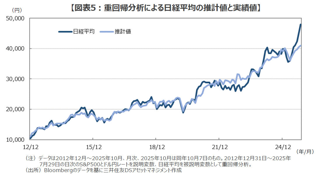 ■日々の日本株の動きを追っていくと、その変動は①米国株の上げ下げと、②ドル円レートの動きに強く影響を受けていることに気付かされます。ちなみに、2012年末以降の市場データを用いて、日経平均の動きを米S&P500種指数とドル円レートを使って統計的に分析(重回帰)すると、モデルの説明力の強さを示す決定係数(補正R2)は約0.96となります。つまり、統計的には、日本株の動きの約96%は米国株と為替の動きで説明できることになります(図表5)。
