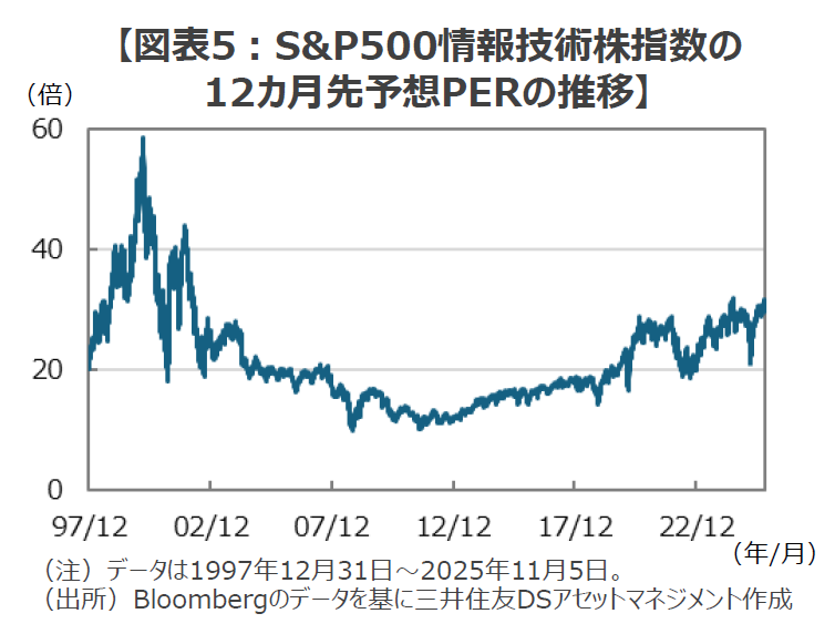 ■米ハイテク株の高い利益成長率と近年の更なる「加速」を見るにつけ、株式市場で相応の高い評価(PER)がつくのはある意味当然と言えそうです。また、S&P500情報技術株指数の予想PERは現在約29.9倍ですが(11月5日現在)、利益成長の加速にもかかわらずレンジ内での「じり高推移」にとどまっているため、バブルを思わせるような株価の過熱感や、極端なPERの切り上がりは見られないように思われます(図表5)。
