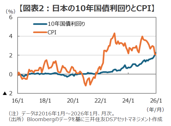 ■ここで重要なのは、諸外国ではインフレの上昇に反応して長期金利が大きく上昇し、その後、ほどなくして長期金利がCPIを上回る状況となりました。一方、日本では長期金利が殆ど上昇せず、高止まりするCPIが長期金利を大きく上回る状況が続くこととなったことです(図表2)。
