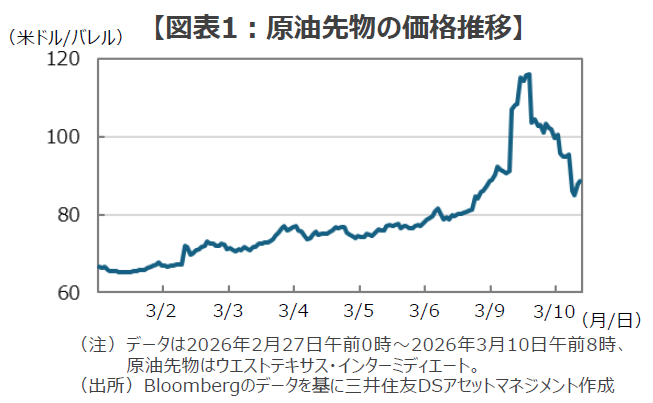 ■週明けのWTI原油先物は東京時間に一時1バレル119.48ドルまで上昇しましたが、その後、G7が原油備蓄を放出すると報じられたことをきっかけに下落に転じ、ニューヨーク時間にはトランプ大統領が「イランにはもう空軍も、通信手段も、海軍もない。戦争の終結は近い」とコメントしたことで一時81.19ドルまで急落、3月10日は80ドル台半ばでの推移となっています(図表1)。