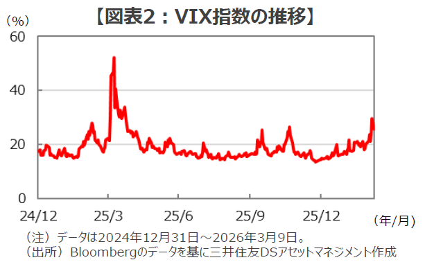 ■また、週明けの米国株市場では、VIX指数(恐怖指数、S&P500のボラティリティ指数)が昨年4月以来となる約35.3ポイントまで上昇したのちに大きく急落したことで(図表2)、世界株のアンカーである米国株が「戦争と原油価格の高騰」という悪材料を咀嚼(そしゃく)して、最悪シナリオを織り込み底打ちしたものと思われます。