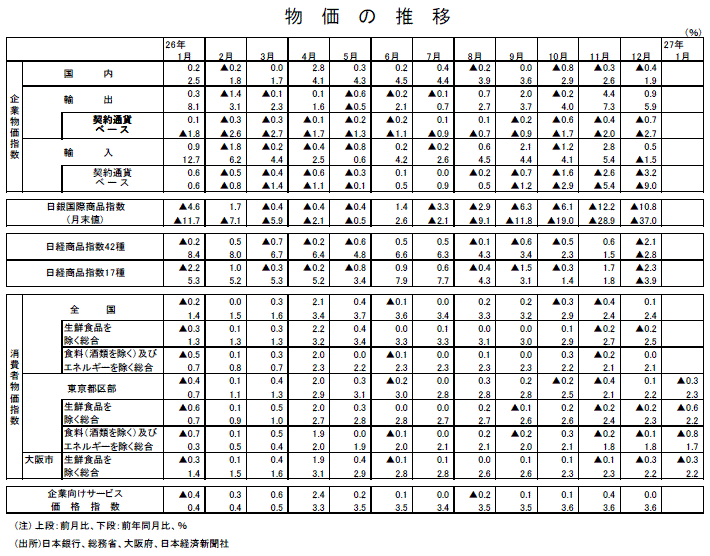 ●12月分の生鮮食品を除く総合指数は2010年を100とした指数は103.2で、前月比▲0.2%の下落、前年同月比は+2.5%の上昇だが11月分の+2.7%から0.2ポイントの鈍化となった。なお前年同月比は19カ月連続で上昇した。19カ月連続でのプラスは96年4月から98年4月にかけて25カ月連続で上昇して以来16年8カ月ぶりのことである。増税分を除いたベースの前年同月比は+0.5%で、3カ月連続して+1.0%を割り込んだ。