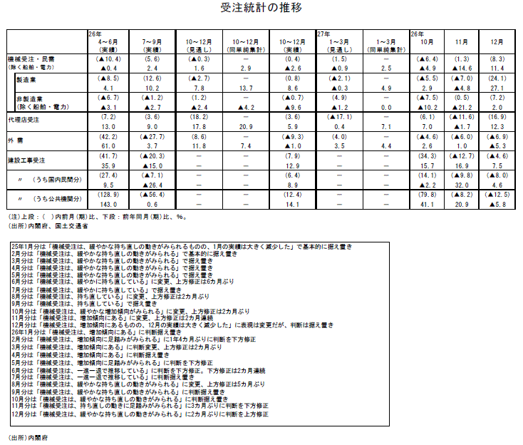 ●内閣府の基調判断は、14年7月分では「機械受注は、一進一退で推移している」であったが、8月分では「機械受注は、緩やかな持ち直しの動きがみられる」と5カ月ぶりの上方修正になり、9月分・10月分では据え置きとなった。前回11月分では「機械受注は、持ち直しの動きに足踏みがみられる」に3カ月ぶりに下方修正されたが、それも一時的で、今回12月分では「機械受注は、緩やかな持ち直しの動きがみられる」と、2カ月ぶりに上方修正され、8~10月分と同じ判断に戻った。