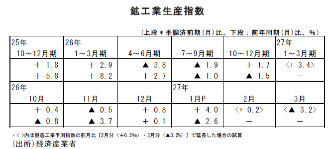 - 1月分鉱工業生産指数・前月比+4.0%で2カ月連続増加 -