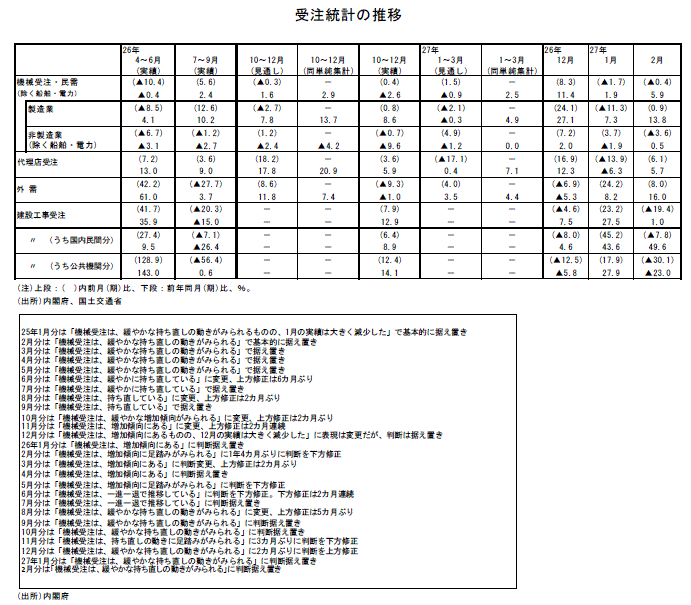 ●内閣府の基調判断は、14年7月分では「機械受注は、一進一退で推移している」であったが、8月分では「機械受注は、緩やかな持ち直しの動きがみられる」と5カ月ぶりの上方修正になり、9月分・10月分では据え置きとなった。11月分では「機械受注は、持ち直しの動きに足踏みがみられる」に3カ月ぶりに下方修正されたが、それも一時的で、12月分では「機械受注は、緩やかな持ち直しの動きがみられる」と、2カ月ぶりに上方修正され、8~10月分と同じ判断に戻った。1月分に続き今回2月分も「機械受注は、緩やかな持ち直しの動きがみられる」と判断据え置きになった。