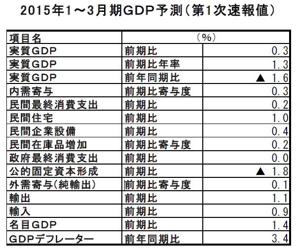 ●約6割のウエイトがある最大の需要項目の実質個人消費は、前期比+0.2%程度と予測する。個人消費の供給サイドの関連データである耐久消費財出荷指数の1~3月期の前期比は+5.4%の増加になった。同じく供給サイドの関連データである非耐久消費財出荷指数は同+1.6%の増加だ。一方、需要サイドの関連データでは、家計調査・二人以上世帯・実質消費支出(除く住居等)は3月分が+2.8%と大きく伸びたものの1~3月期の前期比は0.0%と横ばいにとどまった。乗用車販売台数の1~3月期の前期比は、年末の軽自動車の販売促進の反動などで▲9.5%の減少になった。供給サイドのデータの方が需要サイドのデータより強い感じである。さらにGDP統計の実質個人消費と関連性が高い消費総合指数(月次ベース)1~2月分平均対10~12月分平均比は▲0.08%の減少になっている。総合的に考えると、1~3月期第1次速報値の個人消費は、前期比で小幅な伸び率にとどまる可能性が大きいとみられる。
