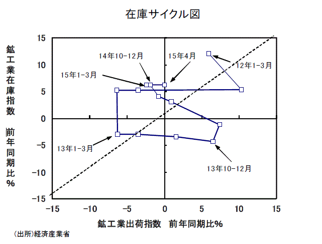 ●鉱工業全体での縦軸に在庫の前年比をとった在庫サイクル図をみると、14年1~3月期では、出荷の前年比が+7.4%、在庫が同▲1.2%、と45度線を下回っていた。しかし、14年4~6月期では、在庫が前年同期比増加に転じ、出荷の前年比が+0.9%、在庫が同+3.1%、と45度線を上回ってしまった。14年7~9月期で、出荷の前年比が▲0.8%、在庫が同+4.1%、と45度線を上回り、14年10~12月期で、出荷の前年比が▲1.9%、在庫が同+6.2%、15年1~3月期で、出荷の前年比が▲2.4%、在庫が同+6.2%と45度線を上回っている。15年4月分でも、出荷の前年比が0.0%、在庫が同+6.3%、と45度線を上回っている。在庫サイクル図からは、依然、在庫積み上がり局面にあると言える。