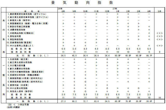 ●一致CIを使った景気の基調判断をみると、13年7月分で景気の基調判断が、「上方への局面変化」から景気拡張の可能性が高いことを示す「改善を示している」に上方修正された後、13年8月分~14年3月分では景気の基調判断は一番良い判断の「改善を示している」で据え置きだった。4月分で「足踏みを示している」に下方修正になり、5月分・6月分・7月分でも「足踏みを示している」に据え置きだった。しかし、8月分で「下方への局面変化」に下方修正され、9月分・10月分・11月分と同じ「下方への局面変化」で据え置きだった。12月分で、「改善を示している。ただし、基調判断に用いている3カ月後方移動平均のこのところの変化幅は、大きいものではない」に上方修正された。「改善を示している」に「下方への局面変化」から戻るのは異例のパスということだった。1月分で、但し書きは消えて、「改善を示している」という判断継続になった。2月分・3月分に続き今回4月分でも、「改善を示している」という判断継続になった。
