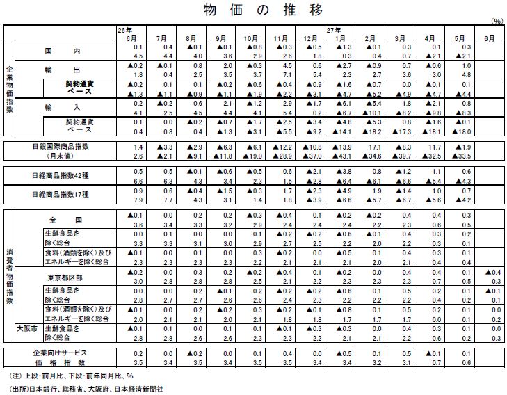 ●東京都区部(速報)の食料(酒類を除く)及びエネルギーを除く総合の6月分前年同月比は+0.2%で5月分の+0.1%から上昇した。2カ月連続の上昇になった。6月分の前月比は0.0%だった。大阪市では6月分の前年同月比は+0.6%と5月分の+0.4%から上昇した。これで21カ月連続の上昇になった。6月分の前月比は0.0%だった。