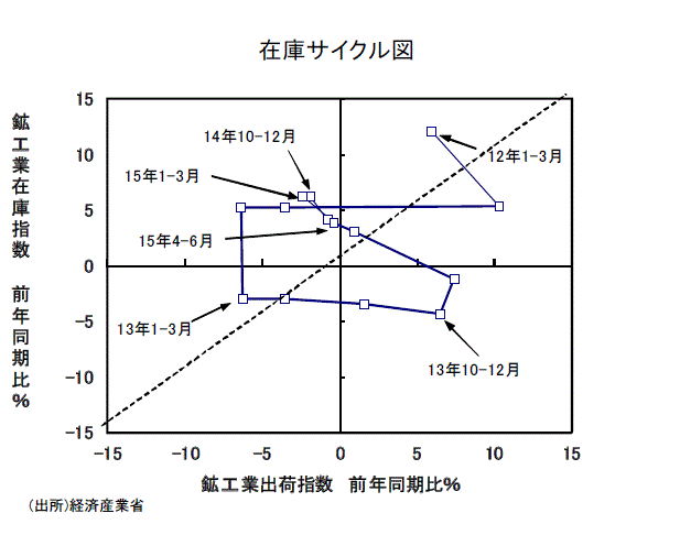 ●鉱工業全体での縦軸に在庫の前年比をとった在庫サイクル図をみると、14年1~3月期では、出荷の前年比が+7.4%、在庫が同▲1.2%、と45度線を下回っていた。しかし、14年4~6月期では、在庫が前年同期比増加に転じ、出荷の前年比が+0.9%、在庫が同+3.1%、と45度線を上回ってしまった。14年7~9月期で、出荷の前年比が▲0.8%、在庫が同+4.1%、と45度線を上回り、14年10~12月期で、出荷の前年比が▲1.9%、在庫が同+6.2%、15年1~3月期で、出荷の前年比が▲2.4%、在庫が同+6.2%と45度線を上回っている。15年4~6月期でも、出荷の前年比が▲0.4%、在庫が同+3.9%、と45度線を上回っている。在庫サイクル図からは、依然、在庫積み上がり局面にあると言える。