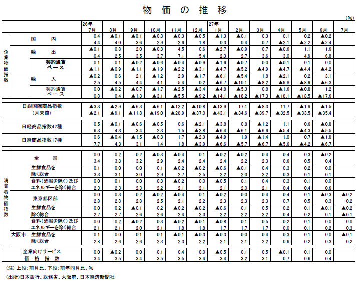 ●6月分の生鮮食品を除く総合指数は2010年を100とした指数は103.4で、前月比0.0%と横這い、前年同月比は+0.1%の上昇となった。5月分の+0.1%と同じ伸び率だった。なお、前年同月比は25カ月連続で上昇した。25カ月連続でのプラスは96年4月から98年4月にかけて25カ月連続で上昇して以来17年2カ月ぶりのことである。