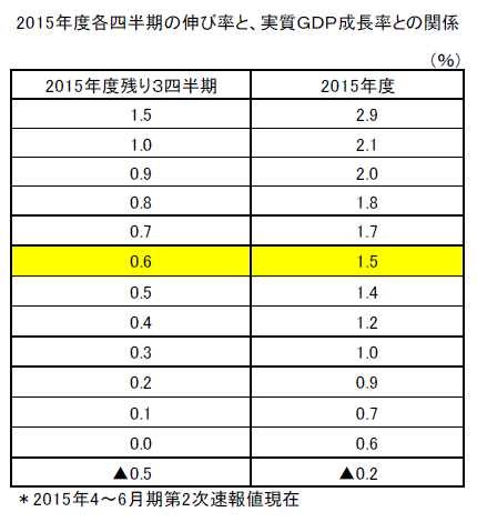 ●15年度実質GDP成長率に関して14年度から15年度のゲタは+0.9%になった。14年度の4~6月期が今回も下方修正になったので、ゲタは第1次速報値の+0.88%から+0.89%と僅かに増えた。15年度の残りの3四半期の前期比が+0.6%・前期比年率+2.3%だと、内閣府年央試算の15年度実質経済成長率+1.5%程度を達成できる。15年度の残りの3四半期の前期比が0.0%だと15年度の実質GDP成長率は+0.6%成長になる。15年度の各四半期の前期比が+0.3%だと15年度の実質GDP成長率は+1.0%成長になる。