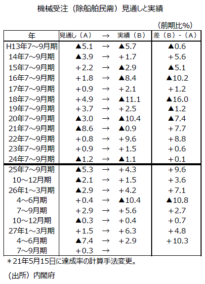 ●これまで7~9月期に関しては実績が見通しから上振れる傾向があった。2009年(平成21年)5月15日に達成率の計算手法に季節調整値を使用するという変更が行われて以降、2009年(平成21年)~14年(平成26年)の6年間では全て「実績」が「見通し」を上回っている。平均で4.9ポイント上回っており、見通し計算のかさ上げ分4.0ポイントを上回っている。今年は、中国発の世界同時株安などで先行きの景気減速懸念が生じたため、例年のように実績が見通しから上振れることはなさそうだ。