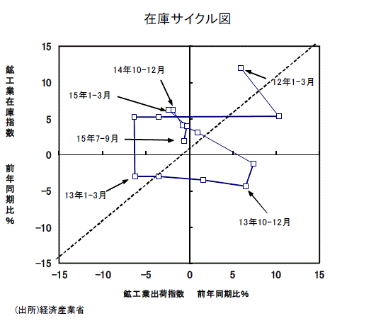 ●鉱工業全体での縦軸に在庫の前年比をとった在庫サイクル図をみると、14年1~3月期では、出荷の前年比が+7.4%、在庫が同▲1.2%、と45度線を下回っていた。しかし、14年4~6月期では、在庫が前年同期比増加に転じ、出荷の前年比が+0.9%、在庫が同+3.1%、と45度線を上回ってしまい、在庫積み上がり局面に入った。14年7~9月期で、出荷の前年比が▲0.8%、在庫が同+4.1%、と45度線を上回り、14年10~12月期で、出荷の前年比が▲1.9%、在庫が同+6.2%、15年1~3月期で、出荷の前年比が▲2.4%、在庫が同+6.2%、15年4~6月期で、出荷の前年比が▲0.3%、在庫が同+4.0%、と45度線を上回っている。15年7~9月期では、出荷の前年比が▲0.6%、在庫が同+2.0%、と在庫の前年比は鈍化してきているものの、まだ45度線を上回っている。