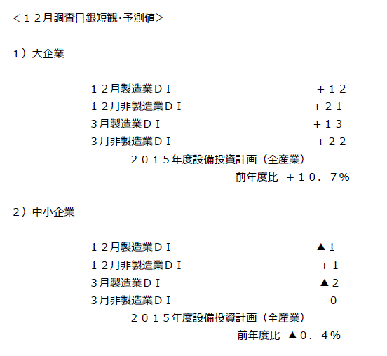 ●2015年度の中小企業・全産業の設備投資実績は12月調査では前年度比▲0.4%程度と6月調査の同▲6.1%から上方修正されると予測した。中小企業の設備投資計画は例年3月調査が弱く、その後は調査の度に改善していく傾向があることなどを参考にした。