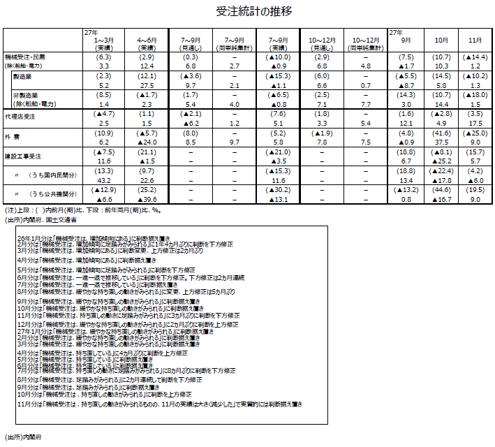 ―内閣府判断「機械受注は、持ち直しの動きがみられるものの、11月の実績は大きく減少した」―