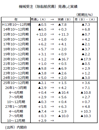 ●内閣府の基調判断は、15年7月分では「機械受注は、持ち直しの動きに足踏みがみられる」に8カ月ぶりに下方修正された。さらに8月分では「機械受注は、足踏みがみられる」へと連続して下方修正となった。8月には中国発世界同時株安など企業心理を冷え込ませる状況が生じたからだ。9月分では判断据え置きだったが、前回10月分では「機械受注は 、持ち直しの動きがみられる」に判断が上方修正された。今回11月分では「機械受注は、持ち直しの動きがみられるものの、11月の実績は大きく減少した」となったが、これは機械受注(除船電民需)前月比が▲14.4%と2ケタの大幅な減少率なので、言及せざるをえなかったのだろう。