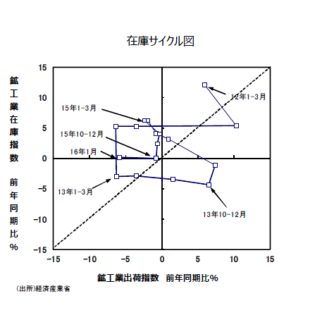 ●⼤きな動きをチェックするために、鉱⼯業全体での縦軸に在庫の前年⽐をとった在庫サイクル図をみると10〜11⽉分で変化が現れた。14年1〜3⽉期では、出荷の前年⽐が+7.4%、在庫が同▲1.2%、と45度線を下回っていた。しかし、14年4〜6⽉期では、在庫が前年同期⽐増加に転じ、出荷の前年⽐が+0.9%、在庫が同+3.1%、と45度線を上回ってしまい、在庫積み上がり局⾯に⼊った。15年7〜9⽉期では、出荷の前年⽐が▲0.6%、在庫が同+2.1%、と在庫の前年⽐は鈍化してきたものの、まだ45度線を上回っていて在庫調整局⾯にあることを⽰していた。15年10〜11⽉分では、出荷の前年⽐が▲0.1%、在庫が同▲0.4%とどちらの前年⽐もマイナスなものの、いったん45度線を下回った。1年半ぶりに15年10〜12⽉期で45度線を割り込むことへの期待があったが、実際は10〜12⽉期では、12⽉分の落ち込みが響き出荷の前年⽐が▲0.8%、在庫が同0.0%、と45度線を上回ったままとなった。16年1⽉分でも出荷の前年⽐が▲5.9%、在庫が同+0.2%、と45度線を上回ったままとなった。
