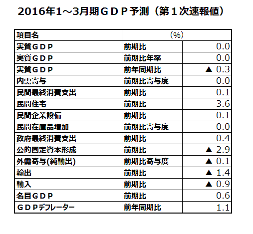 ●5月18日に発表される1~3月期第1次速報値では、実質GDP成長率は前期比0.0%程度、前期比年率0.0%程度を予測する。ESPフォーキャスト調査4月調査の予測平均値前期比年率+0.25%を下回りそうだ。