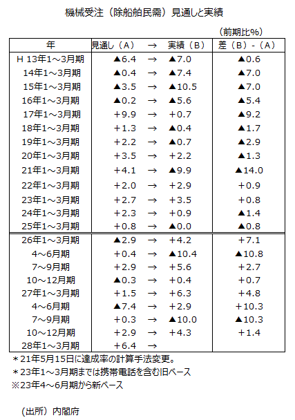●中小企業の動きを反映している部分がある代理店受注の2月分前月比は▲1.8%と1月分の+11.4%の反動もあり2カ月ぶりの減少になった。1~3月期見通しは前期比+1.7%の増加だが、これは3月分前月比が▲17.5%で達成できる。4四半期連続の増加見通しであることは、足元の中小企業の機械の設備投資が底堅いことを裏付けていよう。NHK朝の連続テレビ小説「あさが来た」平均視聴率が23.5%で、2002年度前期放送の「さくら」の23.3%を抜いて今世紀最高を更新したことと整合的だ。前向きな経営者を応援する風潮が、「借得金利(マイナス金利)」の後押しとともに、中小企業の設備投資を後押しすることを期待したい。