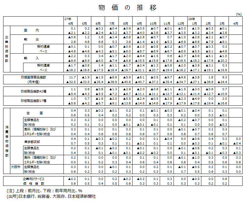 ●4月分の生鮮食品を除く総合の前年同月比は、東京都区部(速報)は▲0.3%で3月分の▲0.3%と同じだった。4カ月連続の下落だ。4月分の前月比は+0.1%だった。大阪市の生鮮食品を除く総合の4月分前年同月比は0.0%で3月分の+0.3%から伸び率が鈍化し、先月まで続いていた35カ月連続の上昇は3年ぶりに途絶えた。4月分の前月比は0.0%だった。