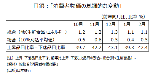 ●総務省の発表を受け、日銀が発表した「消費者物価の基調的な変動」によると、3月分の総合(除く生鮮食品・エネルギー)の前年同月比は+1.1%で、2月分の+1.1%と同じだった。