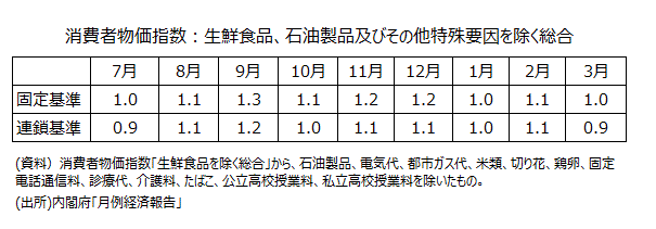 ●また、内閣府も、日銀同様の独自のコア指数をこれまで「月例経済報告」の中で公表してきたが、先月から総務省の発表日にHPに掲載するようになった。内閣府流のコア指数は、消費者物価指数・生鮮食品を除く総合から、石油製品、電気代、都市ガス代、米類、切り花、鶏卵、固定電話通信料、診療代、介護料、たばこ、公立高校授業料、私立高校授業料を除いたものだ。内閣府流コア指数(固定基準)2月分の前年同月比は、日銀のコア指数と同じ+1.1%だったが、3月分は+1.0%と0.1ポイント鈍化した。