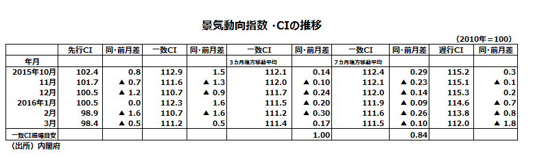 ●3月分の景気動向指数・速報値では、先行CIは前月差▲0.5と2カ月連続の下降となった。3月分の先行CIの指数水準は98.4となった。