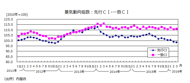 -先行CI前月差▲0.5と2カ月連続下降、一致CI前月差+0.5と2カ月ぶり上昇 -