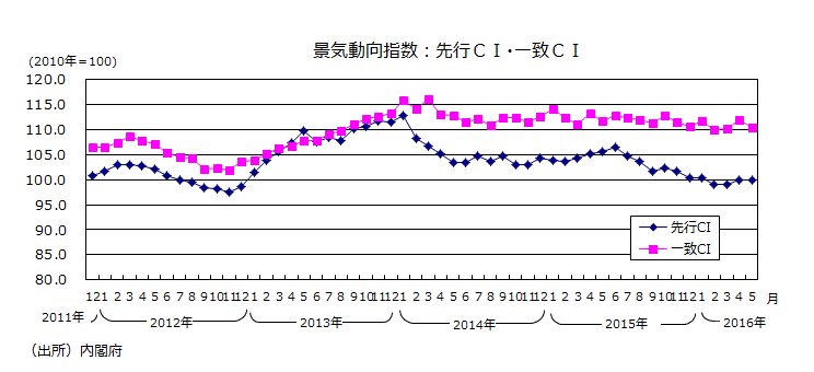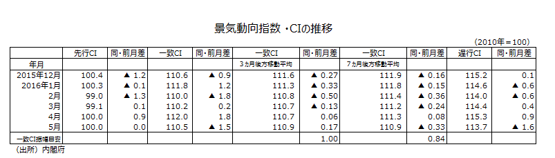 ●最近の一致CIを使った景気の基調判断をみると、14年12月分で、「改善を示している。ただし、基調判断に用いている3カ月後方移動平均のこのところの変化幅は、大きいものではない」に「下方への局面変化」から上方修正された。「下方への局面変化」から「改善を示している」に戻るのは異例のパスということだった。15年1月分で、但し書きは消えて、「改善を示している」という判断継続になった。15年2月分~4月分でも、「改善を示している」という判断継続になったが、5月分で景気拡張の動きが足踏み状態になっている可能性が高いことを示す「足踏みを示している」に下方修正され、15年6月分~16年5月分でも判断据え置きで、1年超もの間、同じ判断となった。