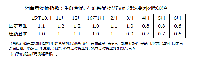 ●また、内閣府流のコア指数は、消費者物価指数・生鮮食品を除く総合から、石油製品、電気代、都市ガス代、米類、切り花、鶏卵、固定電話通信料、診療代、介護料、たばこ、公立高校授業料、私立高校授業料を除いたものだ。内閣府流コア指数(固定基準)3月分の前年同月比は、+1.0%だったが、4月分で15年6月の+0.9%以来の1.0%割れとなった。今回6月分は+0.6%で、日銀流コア指数とは異なり5月分から0.2ポイントも鈍化した。15年4月(+0.6%)以来の低い伸び率である。