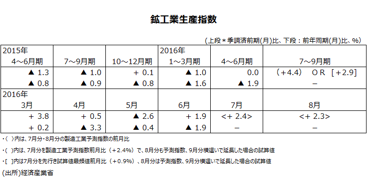 ●経済産業省の基調判断は14年12月分で「総じてみれば、生産は緩やかな持ち直しの動きがみられる」に3カ月ぶりに上方修正された。15年1月分・2月分・3月分・4月分でも「総じてみれば、生産は緩やかな持ち直しの動きがみられる」で据え置きだった。しかし、5月分では「総じてみれば、生産は一進一退で推移している」に11カ月ぶりに下方修正された。「一進一退」の表現は14年11月分以来6カ月ぶりだった。6月分に続き7月分でも判断は「総じてみれば、生産は一進一退で推移している」に据え置かれた。8月分では14年8月分以来の「弱含み」に下方修正され、表現は「総じてみれば、生産は弱含んでいる」となった。