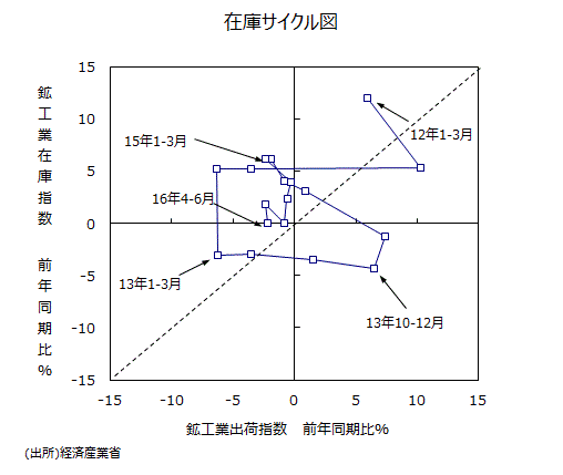●大きな動きをチェックするために、鉱工業全体での縦軸に在庫の前年比をとった在庫サイクル図をみると14年1~3月期では、出荷の前年比が+7.4%、在庫が同▲1.2%、と45度線を下回っていた。しかし、14年4~6月期では、在庫が前年同期比増加に転じ、出荷の前年比が+0.9%、在庫が同+3.1%、と45度線を上回ってしまい、在庫積み上がり局面に入った。15年10~12月期では、出荷の前年比が▲0.8%、在庫が同0.0%、と近づいたものの45度線をやや上回った。16年1~3月期でも出荷の前年比が▲2.4%、在庫が同+1.8%だった。4~6月分では、出荷の前年比が▲2.2%、在庫が同0.0%と45度線を上回ったままとなっている。