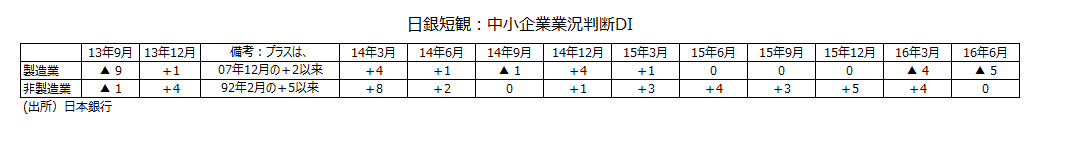 ●6月調査の大企業・非製造業・業況判断DI+19は、12月調査の「先行き」+17を2ポイント上回る数字で、景況感が思ったより良かったことを示唆している。大企業・非製造業で「悪い」と答えた割合は15年6月調査・9月調査・12月調査で同じ4%であったが、16年3月調査では1ポイント上昇し5%に、今回の6月調査でも1ポイント上昇し6%と、じりじりと悪化している。