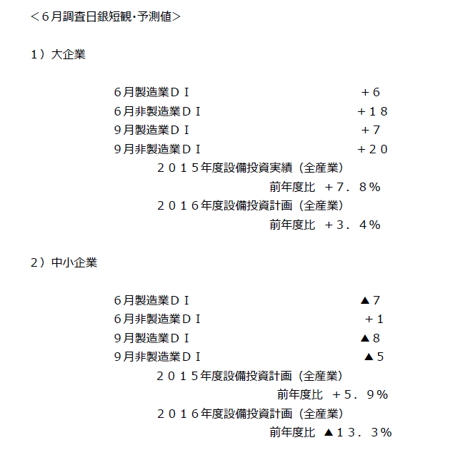 ●2015年度の中小企業・全産業の設備投資実績は6月調査では前年度比+5.9%程度と3月調査の実績見込み同+3.9%から上方修正されると予測した。中小企業の設備投資計画は例年3月調査が弱く、その後は1年後の3月調査まで調査の度に改善していく傾向があることなどを参考にした。