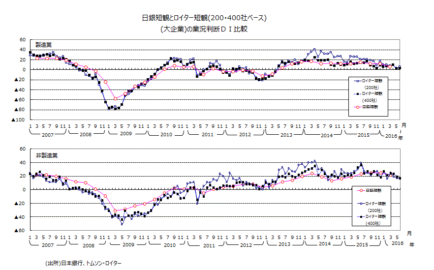 -大企業・製造業の業況判断DIはQUICK上昇、ロイター下降から、日銀短観横這いを予測-